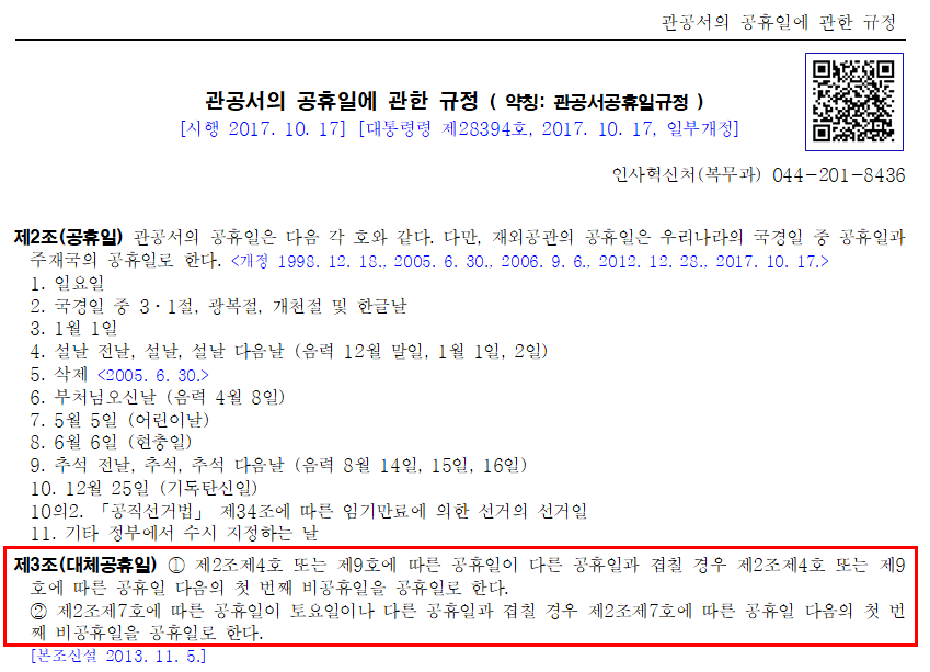 1) 설날이나, 추석의 경우 다른 공휴일과 겹칠 경우 첫번째 비공휴일을 공휴일로 한다.
