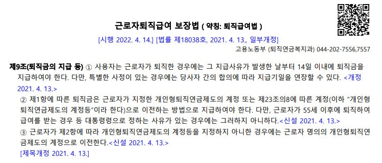 제9조(퇴직금의 지급 등) ① 사용자는 근로자가 퇴직한 경우에는 그 지급사유가 발생한 날부터 14일 이내에 퇴직금을 지급하여야 한다. 다만, 특별한 사정이 있는 경우에는 당사자 간의 합의에 따라 지급기일을 연장할 수 있다. <개정 2021. 4. 13.>