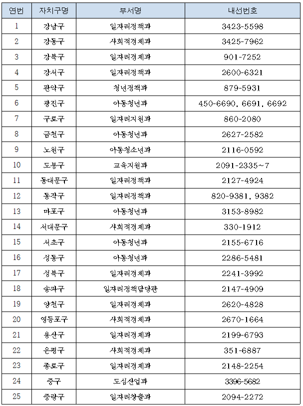 추가적으로 궁금하신 사항은 다음의 자치구별 담당부서에 연락하시어 확인해보시면 가장 정확할 것 입니다.