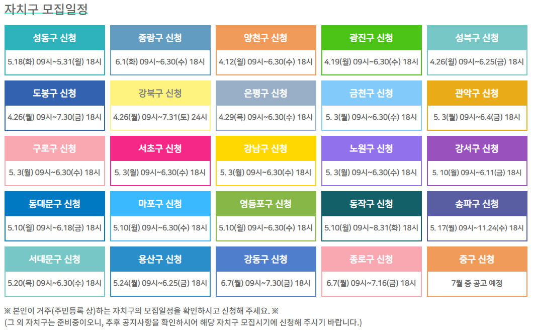 자치구별로 접수 일정과 세부기준이 다르니, 주민등록상 거주지로 등록된 해당 자치구의 공고문을 확인해주시면 됩니다.