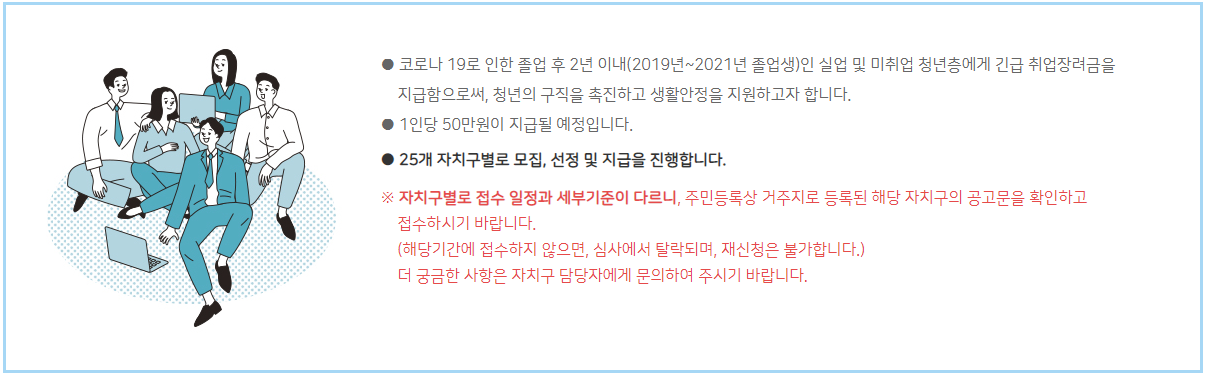 - 코로나 19로 인한 졸업 후 2년 이내(2019년~2021년 졸업생)인 실업 및 미취업 청년층에게