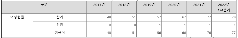 여성근로자수는 20년도 67명, 21년도 77명, 22년도 78명이며, 약 32%로 구성되어 있습니다.