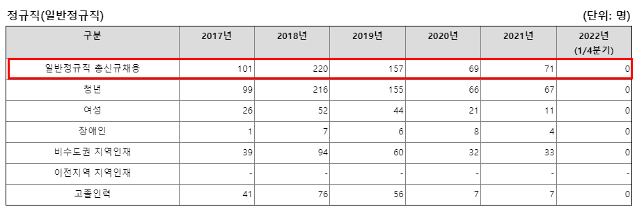 21년도 기준으로 71명 신규채용하였습니다.
