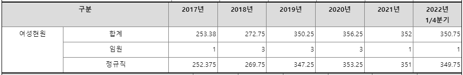 여성근로자수는 20년도 353명, 21년도 351명, 22년도 349명이며, 약 16.9%로 구성되어 있습니다.