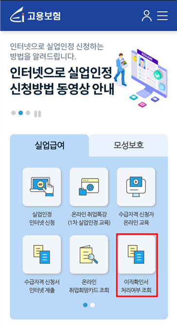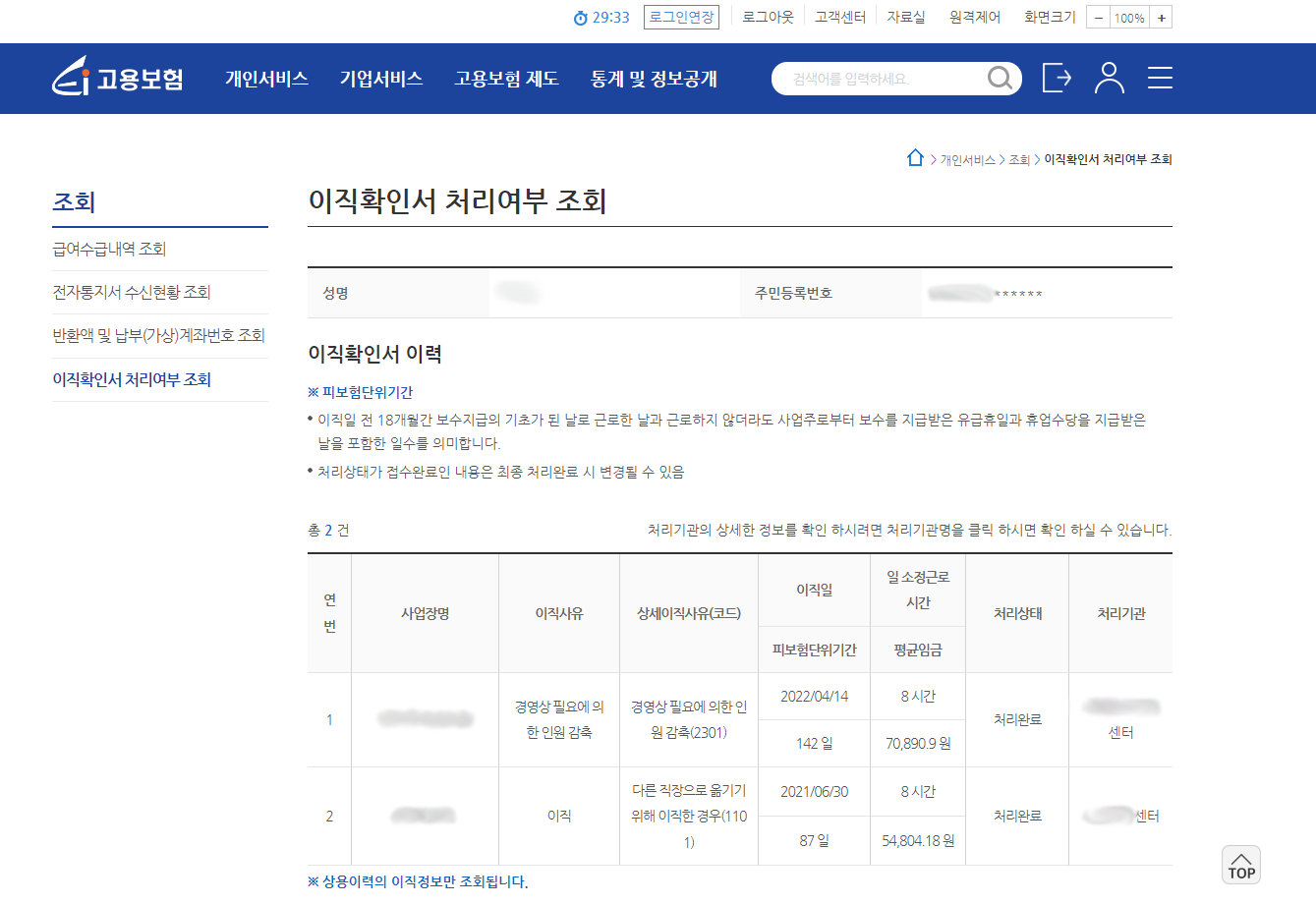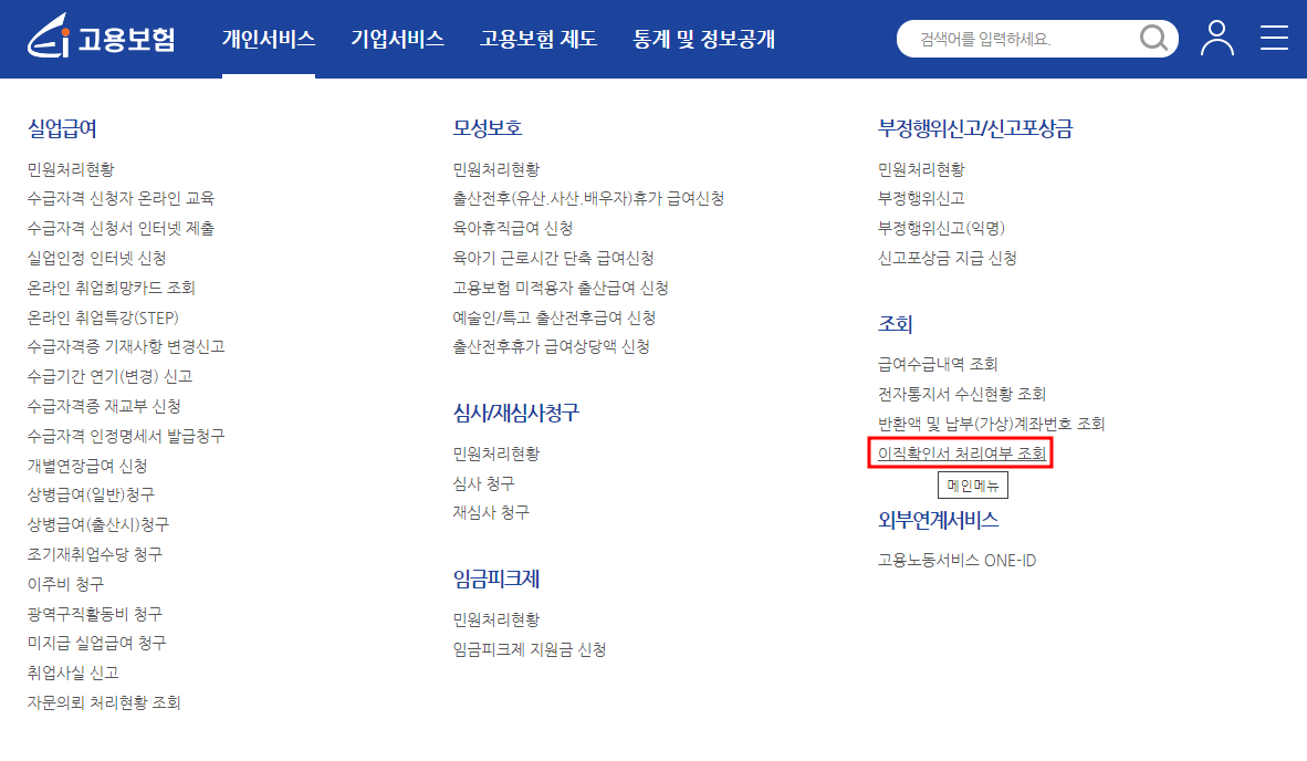 2) 개인서비스 -> 조회 -> 이직확인서 처리여부 조회