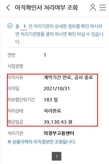 위와 같이 이직사유, 이직일, 피보험단위기간, 처리상태, 평균임금, 처리기관 확인이 가능합니다.