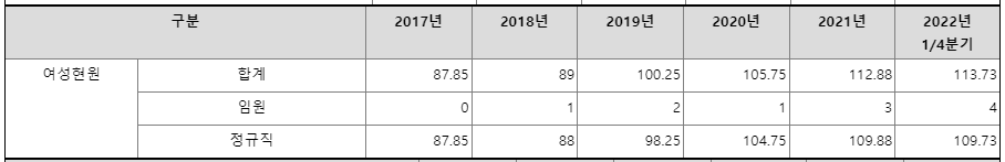 여성근로자수는 20년도 104명, 21년도 109명, 22년도 109명이며, 약 37.2%로 구성되어 있습니다.