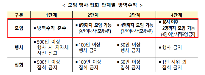 단계가 완하되면, 현재 5인이상 집합금지 조치가 해지되며 8명까지 모임이 가능합니다.