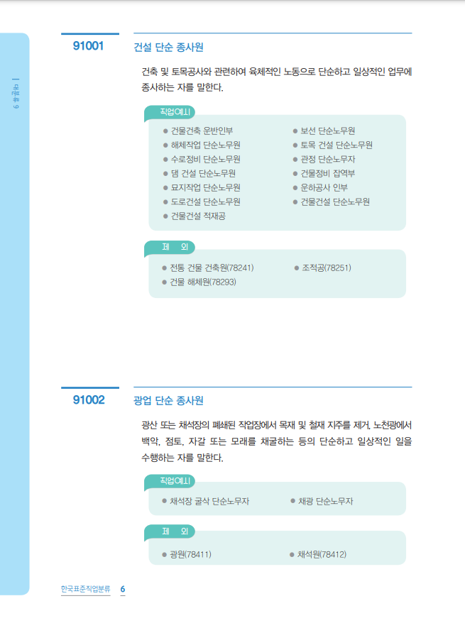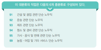 중분류는 건설, 운송, 제조, 청소 및 경비, 가사·음식 및 판매, 농림·어업과 기타 서비스 관련 단순 노무직 순으로 배열되어 있다.