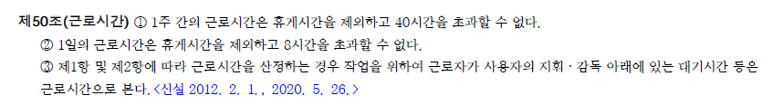 주 52시간 = 법정근로시간 40시간 + 연장근무 12시간 입니다.