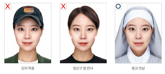- 얼굴을 머리카락이나 장신구 등으로 가리면 안되고 얼굴 전체(이마부터 턱까지)가 나와야 합니다.