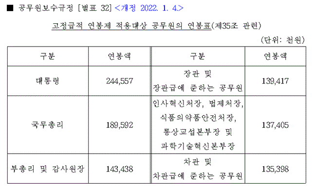 2022년도 대통령 연봉은 2억4455만7000원, 국무총리 1억8959만2000원, 부총리 및 감사원장 1억4343만8000원, 장관 및 장관급에 준하는 공무원 1억3941만7000원, 인사혁신처장, 법제처장, 식품의약품안전처장, 통상교섭본부장 및 과학기술혁신본부장 1억3740만5000원, 차관 및 차관급에 준하는 공무원은 1억3539만8000원으로 결정되었습니다.