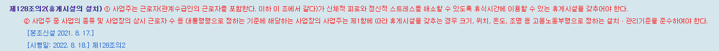 결론적으로, 휴게시설 관련조항은 상시근로자 50인 이상 사업장에서는 22년 8월 18일부터, 50인 미만 사업장은 시행령 시행 이후 1년이 경과한 23년 8월 18일부터 적용됩니다.