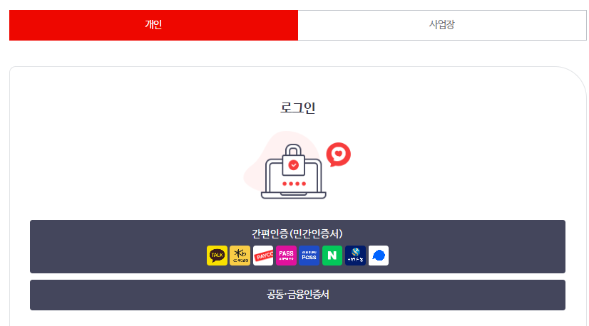 ② 공동, 금융인증서 또는 카카오톡 등 간편인증(민간인증서) 로그인