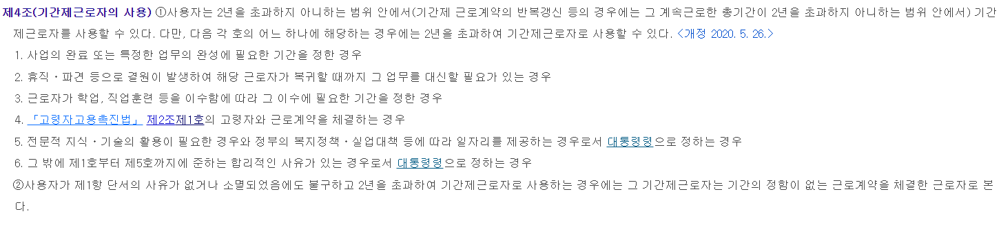 ①사용자는 2년을 초과하지 아니하는 범위 안에서(기간제 근로계약의 반복갱신 등의 경우에는 그 계속근로한 총기간이 2년을 초과하지 아니하는 범위 안에서) 기간제근로자를 사용할 수 있다. 다만, 다음 각 호의 어느 하나에 해당하는 경우에는 2년을 초과하여 기간제근로자로 사용할 수 있다. <개정 2020. 5. 26.>