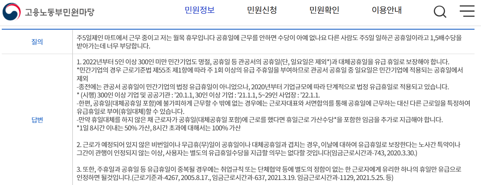 고용노동부 답변