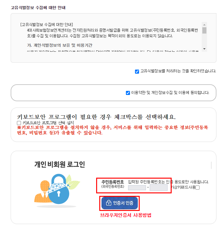 개인비회원 로그인을 해주시고, 개인정보 수집 동의, 주민번호 입력 후 공인인증서로 로그인해주시면 됩니다.