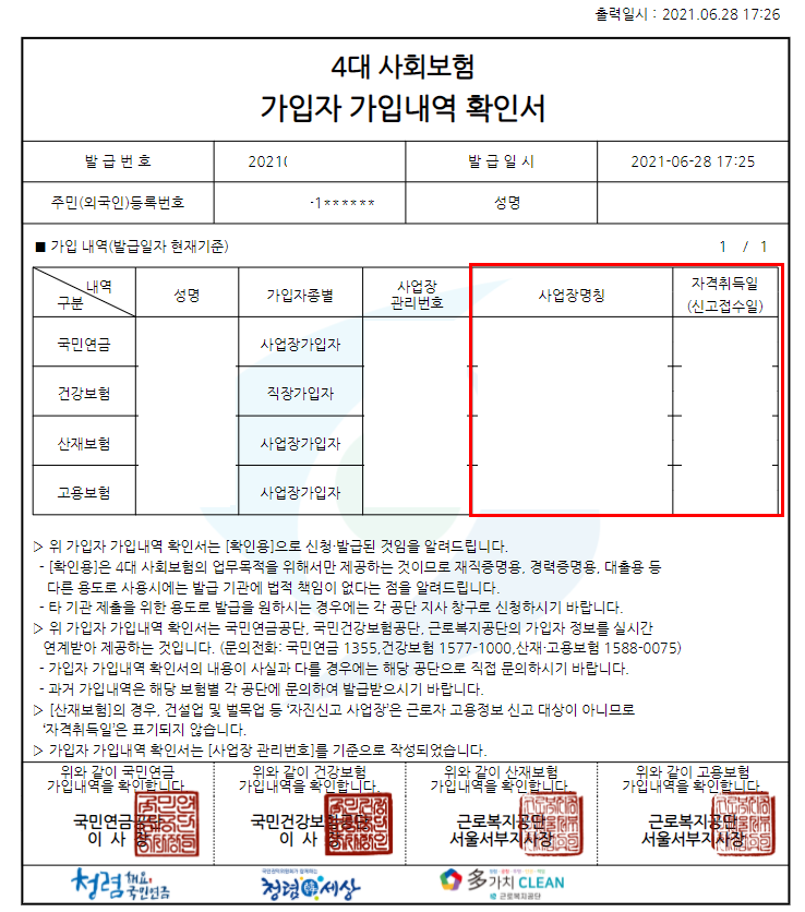 혹여나 4대보험에 가입이 되어 있지 않다면, 회사 인사부서에 소급하여 취득할 수 있도록 요청하시기 바랍니다.