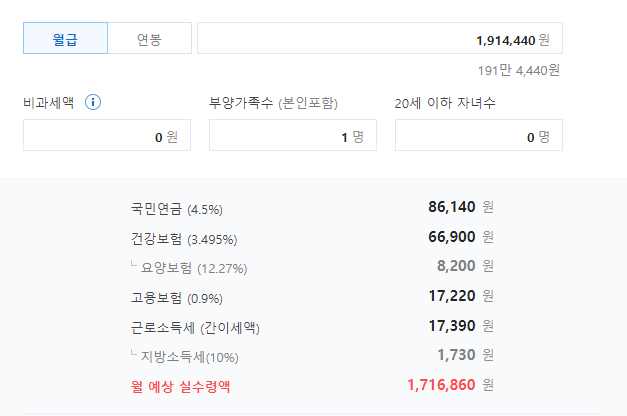 2022년도 기준 최저임금은 1,914,440원이며 실수령액은 1,716,860원입니다.