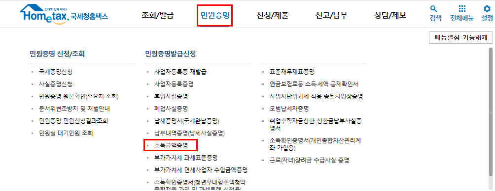 2) 민원증명 -> 소득금액증명 클릭