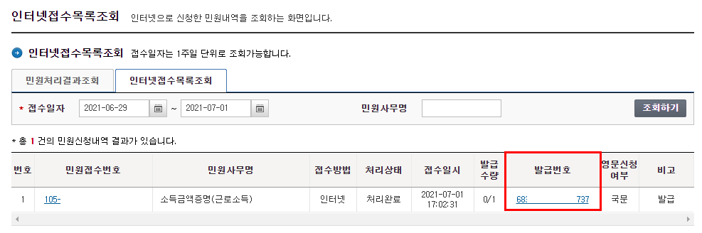 이 때, 발급번호(파랑색)을 클릭해주시면 됩니다.