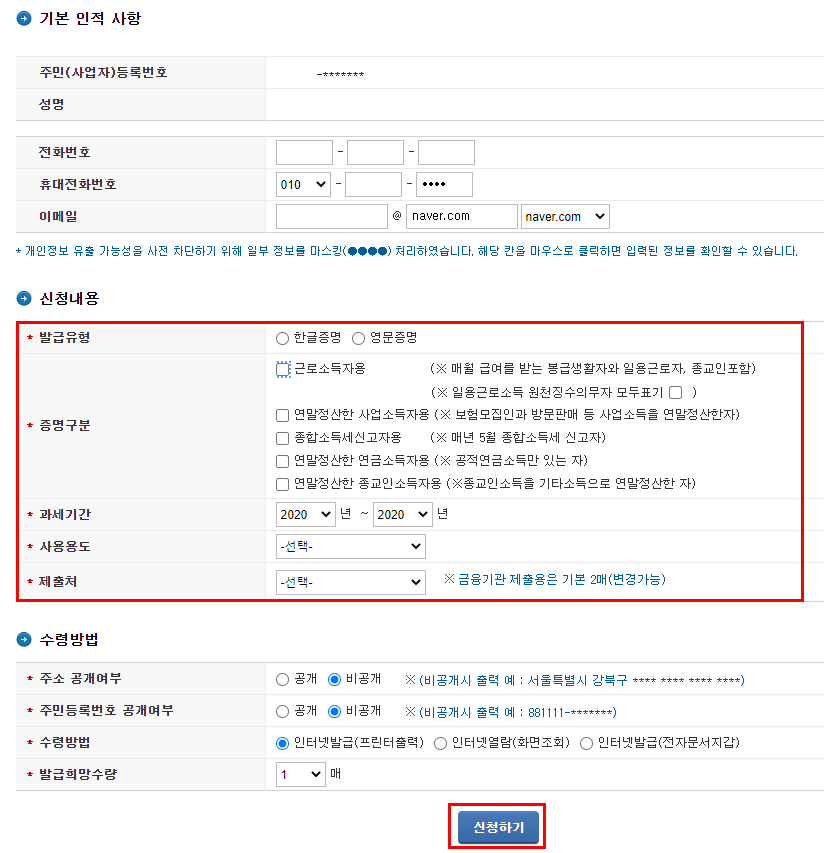 3) 기본 인적 사항 및 신청내용 확인 후 신청하기
