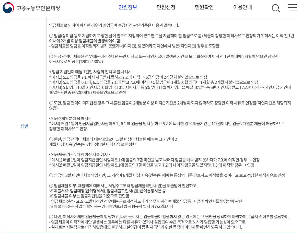○ 또한, 임금 전액이 미지급된 경우 그 체불된 임금이 2개월분 이상 미지급기간은 2개월이 되지 않더라도 정당한 이직 사유로 인정함(지연지급은 해당되지 않음)