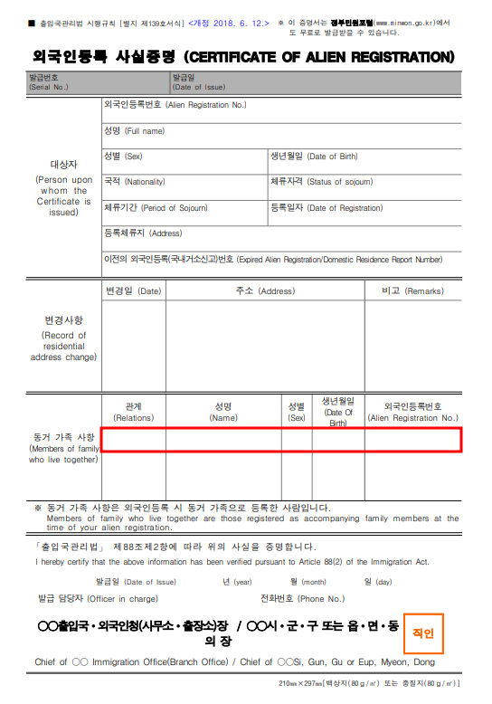 외국인등록사실증명서 하단에 가족관계를 확인할 수 있기 때문에 해당 서류로 관계를 갈음할 수 있습니다.