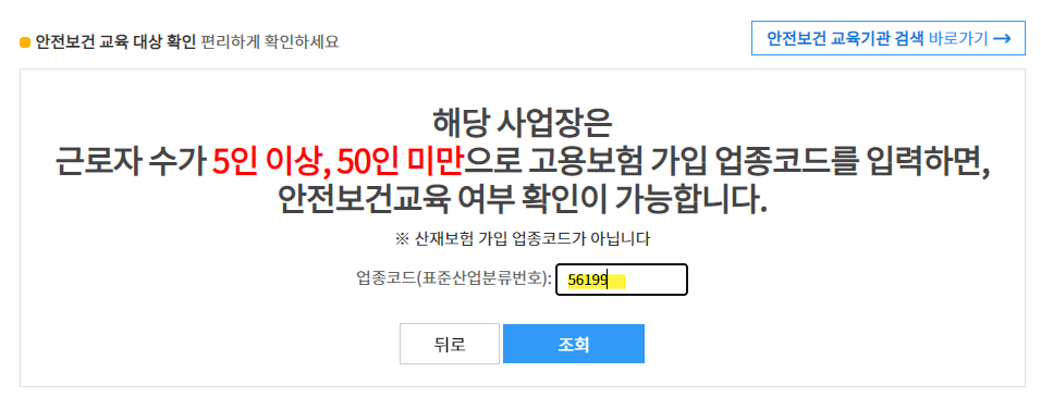 업종코드와 상시근로자수를 입력하시면, 안전보건교육 대상인지 확인할 수 있습니다.