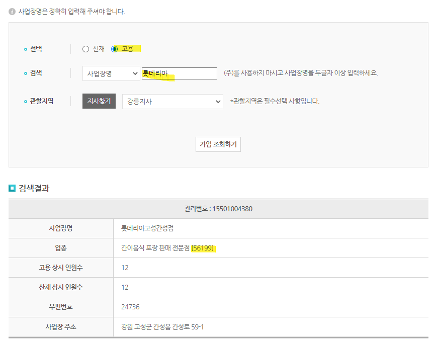 업종코드인 "56199" 를 입력해주고, 조회를 눌러줍니다.