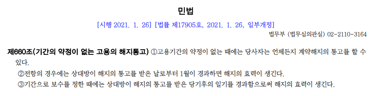 660조 3항과 관련하여 기간으로 보수를 정한 때(일반적으로 월급제)에는 당기(當期) 후 1기(期)가 경과되어야 효력이 발생합니다. 즉, 7월 11일에 퇴사통보를 하였다면, 당기(7월) 후 1기(8월)가 경과된 9월 1일에 퇴사효력이 발생하는 것 입니다.
