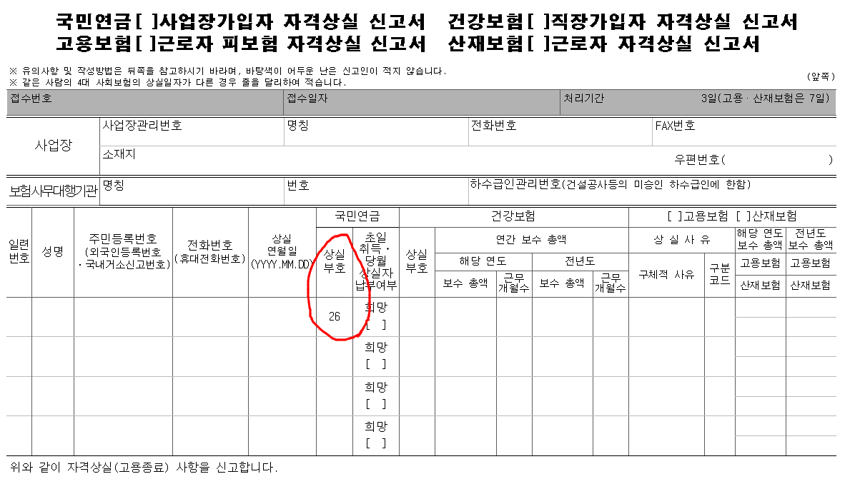 취득취소일 경우 상실신고서를 작성해주시면 되고, 상실부호에 '26번' 코드를 기입해주시면 됩니다.