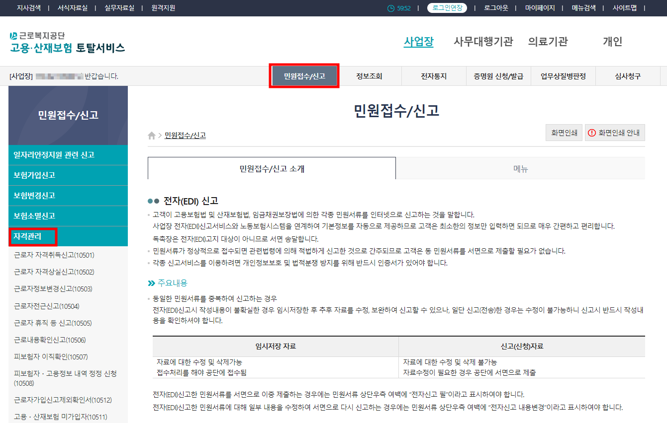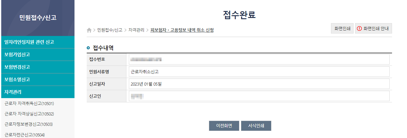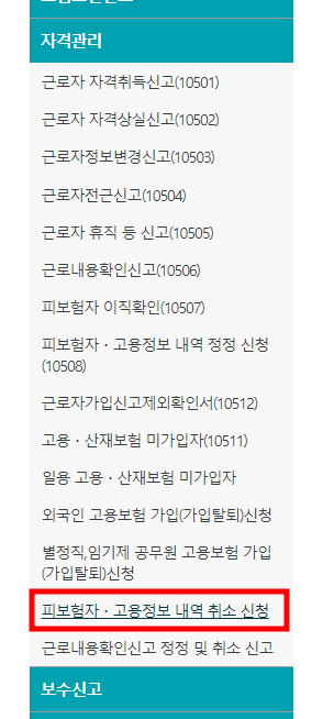 ① 민원접수/신고 → 자격관리 → 피보험자 고용정보 내역 취소 신청 접속