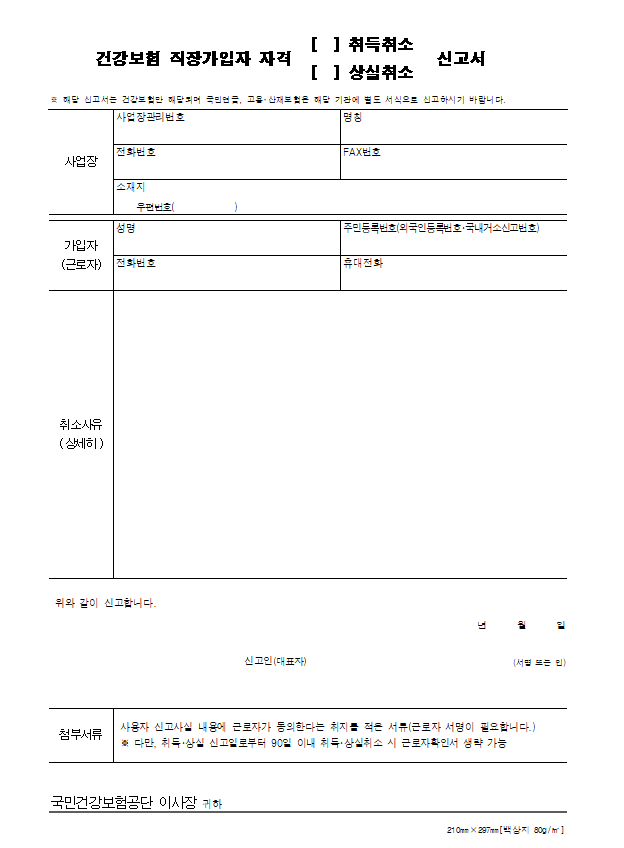 건강보험은 다음의 서류를 작성하여 본인 사업장관할 건강보험 지사로 팩스 송부하시면 됩니다.