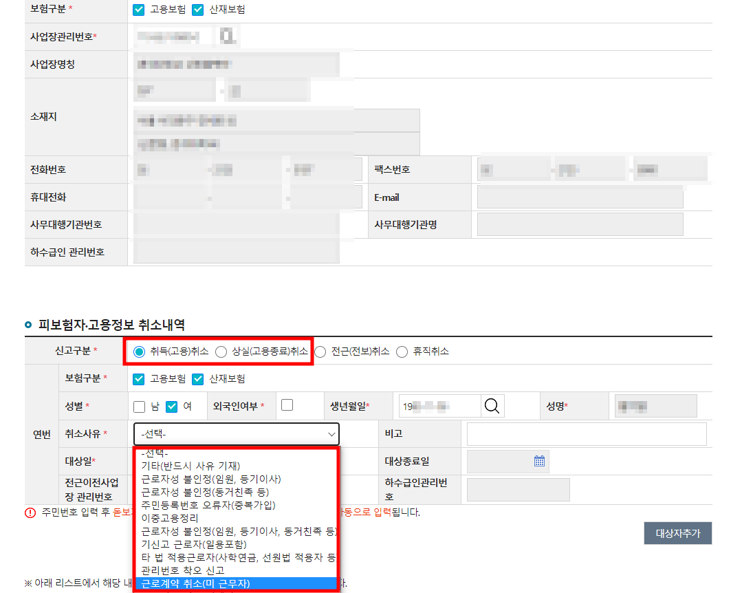 ② 사업장정보를 입력하시고, 취득취소인지 상실취소인지 확인해줍니다.