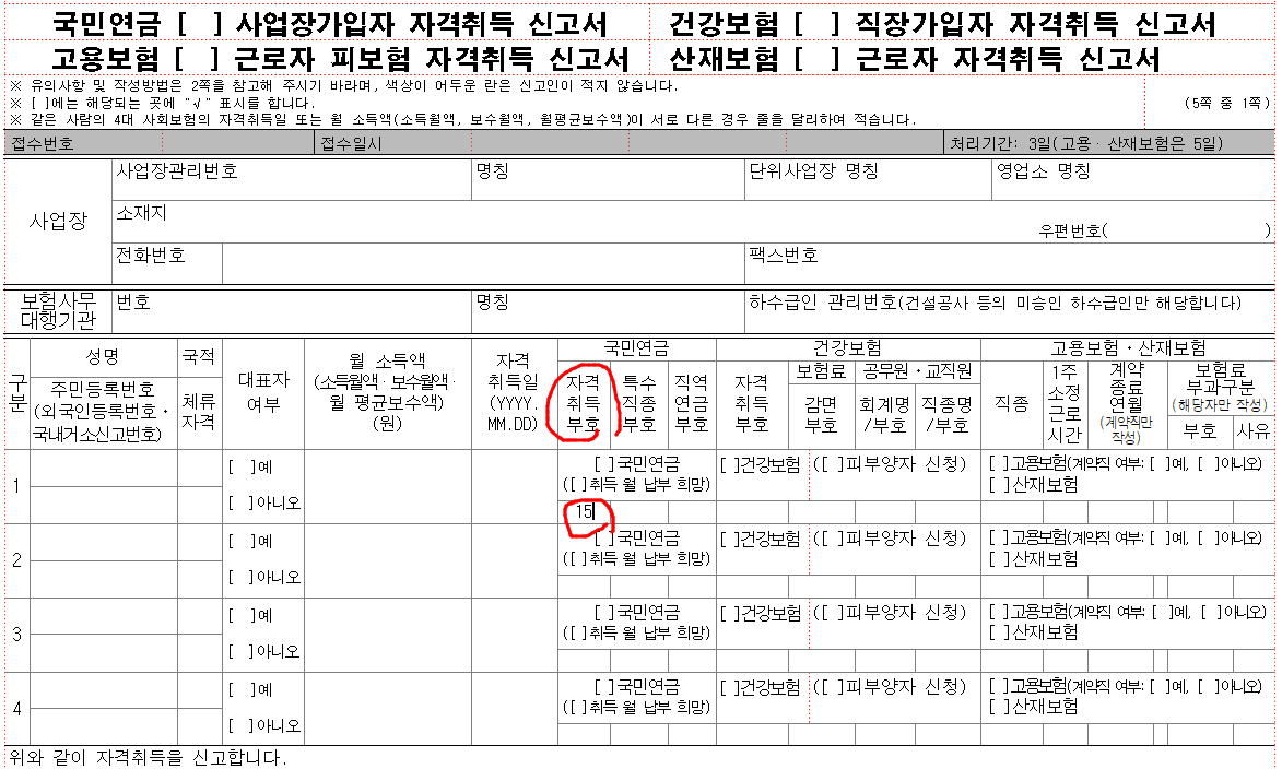 상실취소일 경우 취득신고서를 작성해주시면 되고, 자격취득부호에 '15번' 코드를 기입해주시면 됩니다.