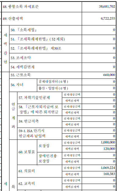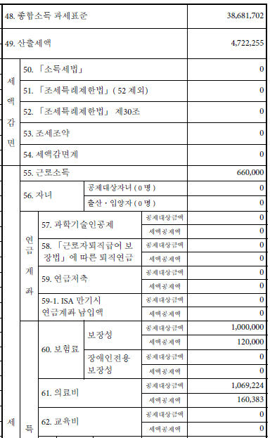 위와 같이 소득공제를 하여 최종적인 소득은 38,681,702원이라는 것을 알게 되었습니다.