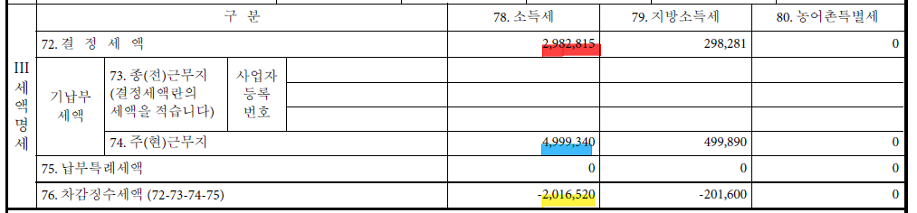 76. 차감징수세액 : 72번(결정세액) - 74번(기납부세액). 마이너스(-)면 환급