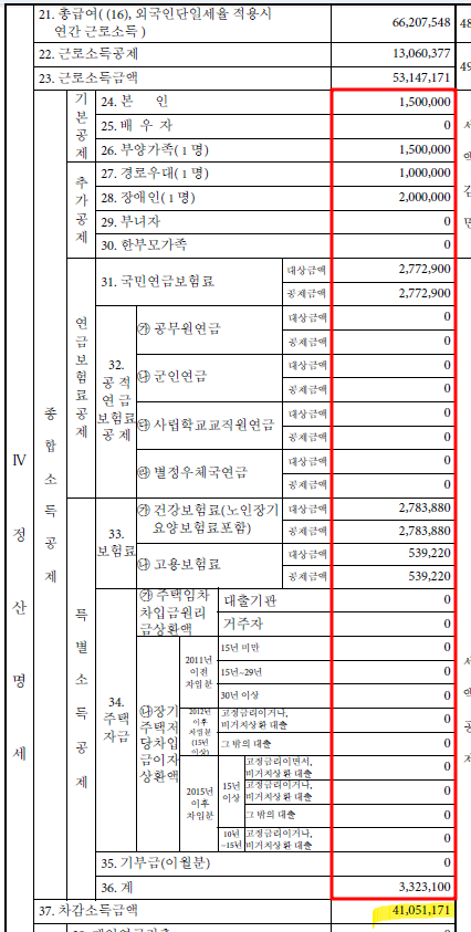 근로소득금액 53,147,171원에서 부양가족 등 인적공제, 4대보험료를 제외하니 소득금액은 41,051,171원이 됩니다.