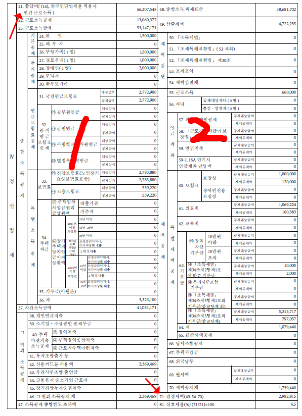 원천징수영수증 2페이지입니다. 연말정산은 21번부터 71번까지 순서대로 진행한다고 생각하시면 되겠습니다.
