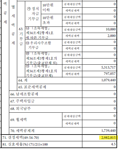 산출세액(49)에서 근로소득(55) - 보험료(60) - 의료비(61) - 기부금(63) 을 공제하고 최종적으로 납부해야할 세금은 2,982,815원으로 결정 되었습니다.