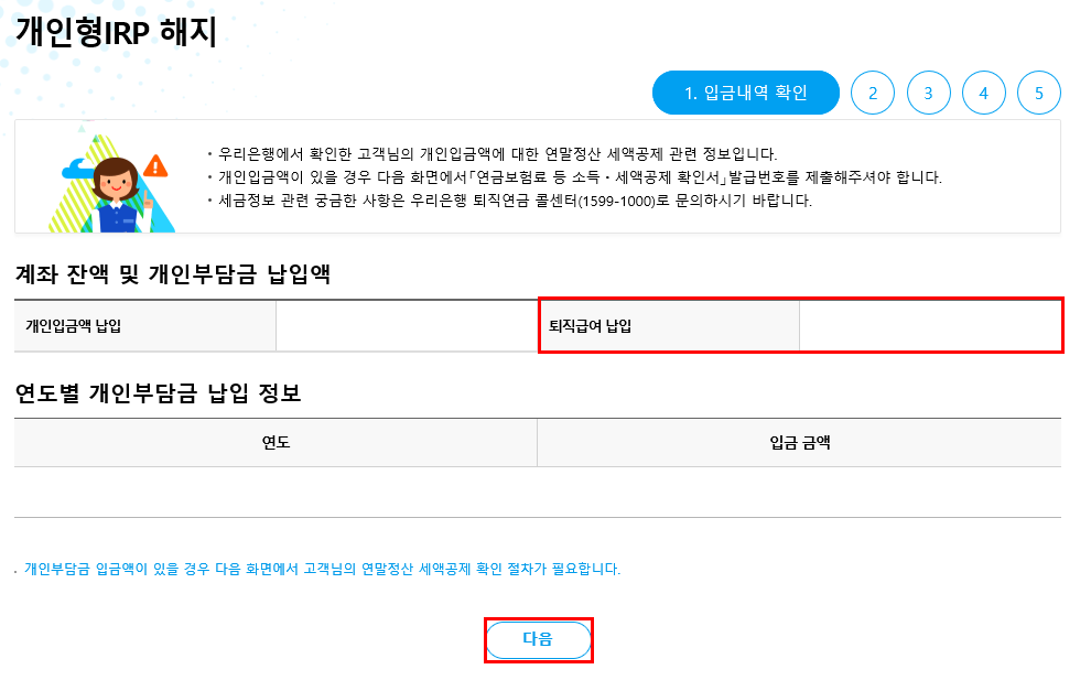 ④ 퇴직급여 납입액 확인 후 다음