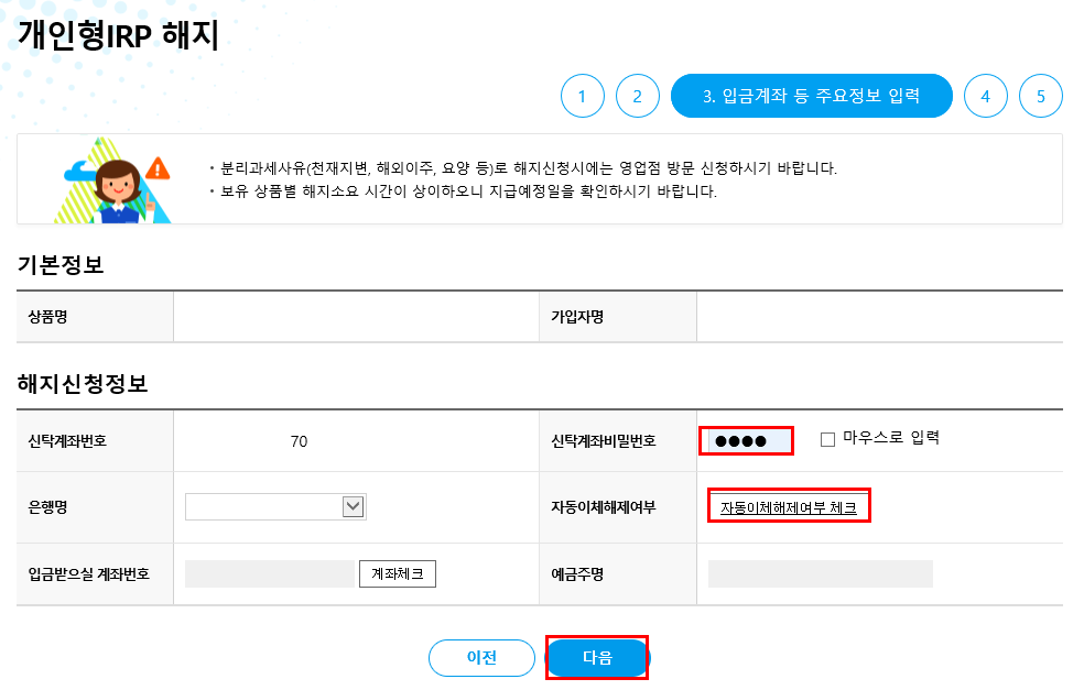⑤ 계좌비밀번호 입력 및 자동이체해제여부 체크