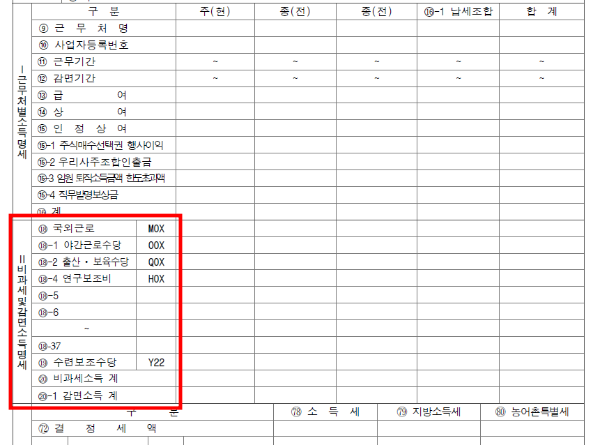 지급명세서에 보면 "비과세 및 감면소득명세" 라고 있습니다. 이 부분에는 비과세 소득을 입력해주어야 합니다.