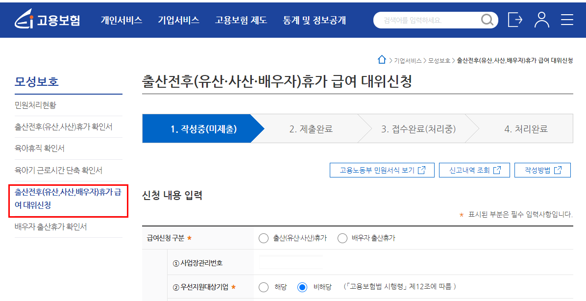온라인 : 사업주가 확인서를 접수 한 후 신청인(출산휴가대상자)이 급여신청서를 접수합니다.