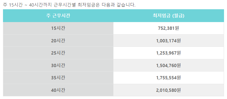다음은 근무시간별 최저임금입니다.