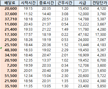 거리별, 시간대별 단가가 다 다르며, 평균적으로 건당 20분 정도 소요되는 것 같습니다.