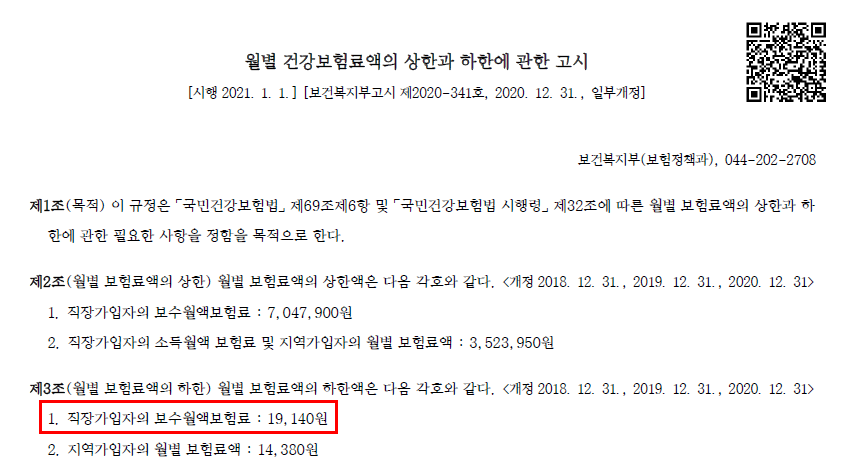 월별 건강보험료액의 상한과 하한에 관한 고시 (보기)