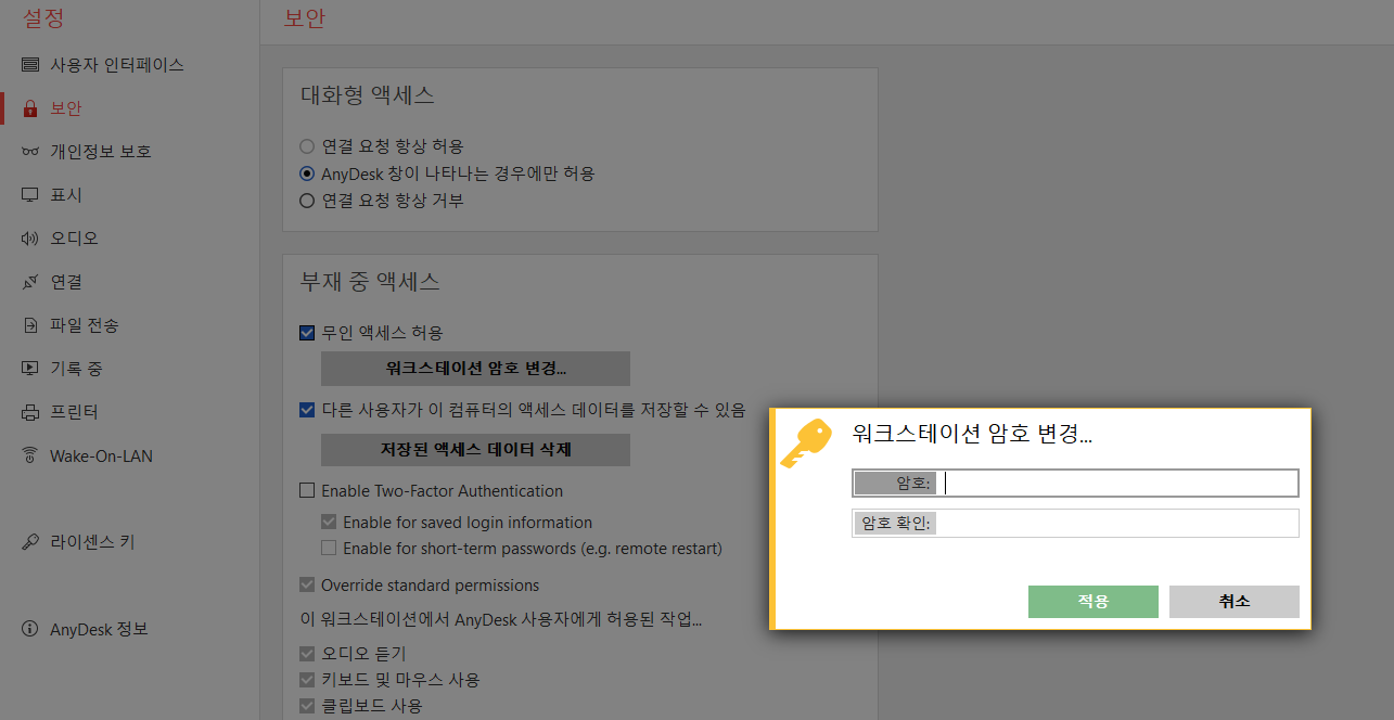 "보안 -> 무인 액세스 허용"을 클릭해 주시고, 암호를 설정해주시면 끝입니다.