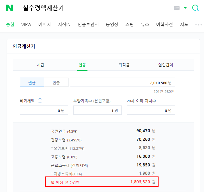 실수령액계산기 : 네이버 통합검색
